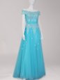 Off the Shoulder Cap Sleeves Floor Length Beading and Appliques Zipper Prom Evening Gown with Aqua Blue