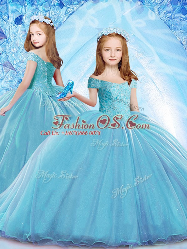 Off The Shoulder Cap Sleeves Little Girl Pageant Dress Brush Train Beading Baby Blue Organza