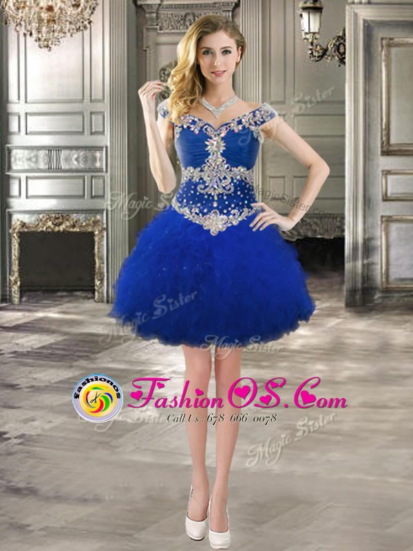 Off the Shoulder Cap Sleeves Mini Length Lace Up Club Wear Royal Blue and In for Prom and Party with Beading and Ruffles