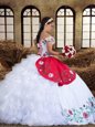 Home >  Quinceanera Dresses >  Perfect Quinceanera Dresses > Off the Shoulder Cap Sleeves Organza and Taffeta Floor Length Lace Up Ball Gown Prom Dress in White and Red for with Embroidery and Ruffled Layers