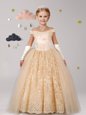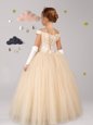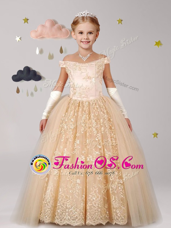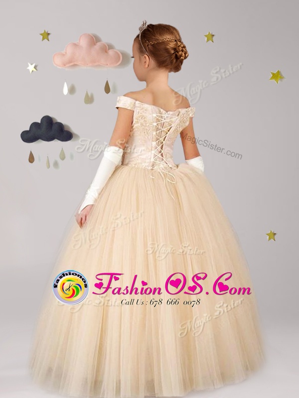 Off the Shoulder Champagne Cap Sleeves Tulle Lace Up Flower Girl Dresses for Party and Quinceanera and Wedding Party