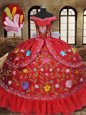 Off the Shoulder Floor Length Lace Up 15th Birthday Dress Red and In for Military Ball and Sweet 16 and Quinceanera with Embroidery and Bowknot