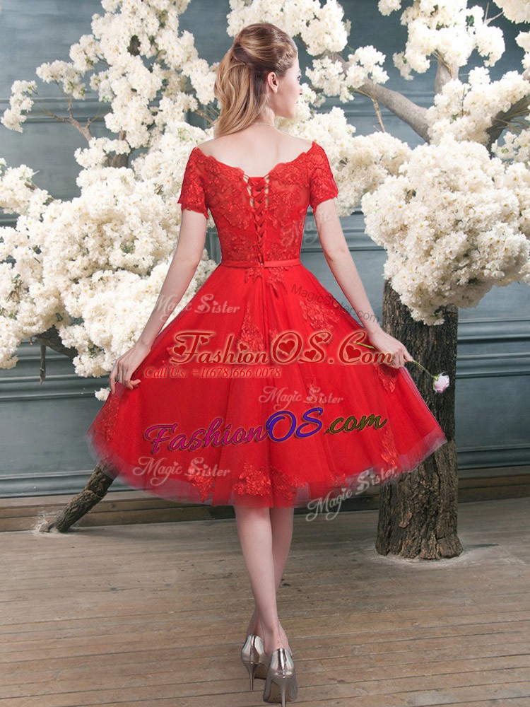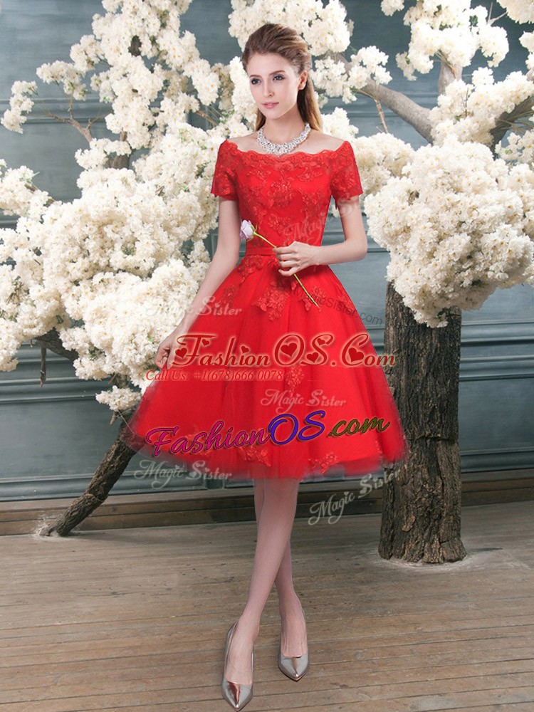 Off The Shoulder Short Sleeves Prom Gown Knee Length Lace Red Tulle