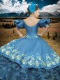 Off The Shoulder Short Sleeves Sweet 16 Quinceanera Dress Floor Length Appliques and Ruffles Blue Organza