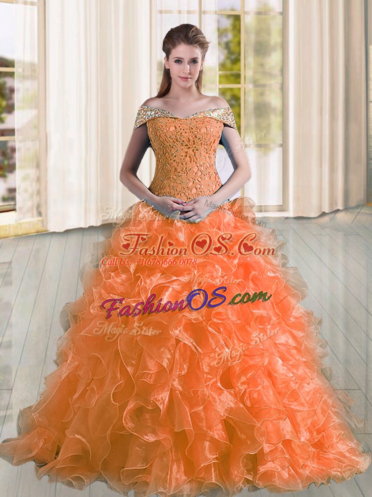 Off The Shoulder Sleeveless 15th Birthday Dress Sweep Train Beading and Lace and Ruffles Orange Organza