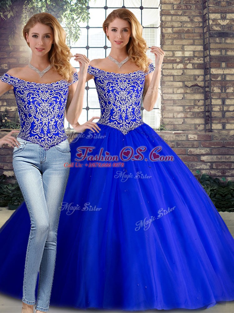 Off The Shoulder Sleeveless Brush Train Lace Up Quinceanera Gown Royal Blue Tulle