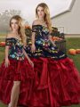 Off The Shoulder Sleeveless Lace Up Ball Gown Prom Dress Red And Black Organza