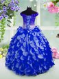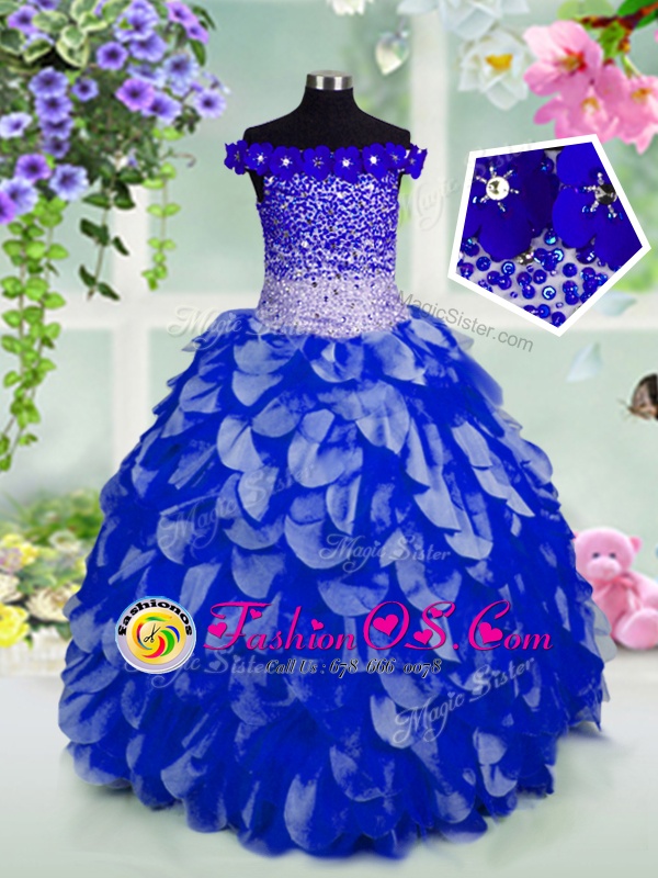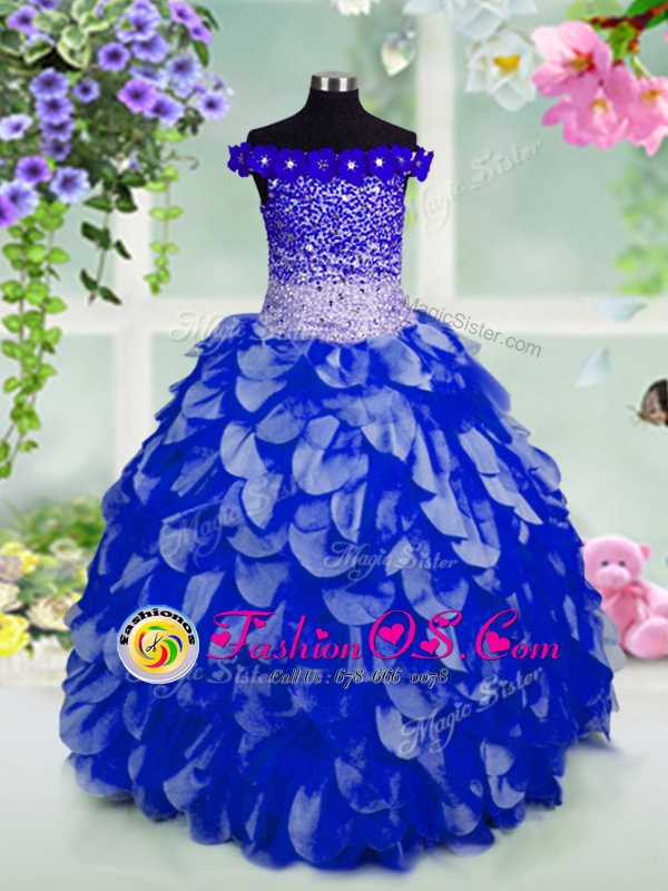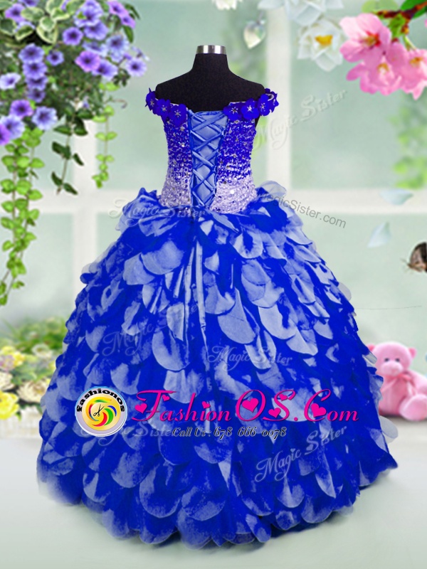 Off The Shoulder Sleeveless Lace Up Kids Pageant Dress Royal Blue Organza