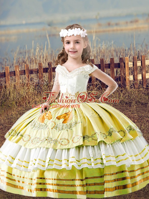 Off The Shoulder Sleeveless Lace Up Little Girl Pageant Gowns Yellow Satin