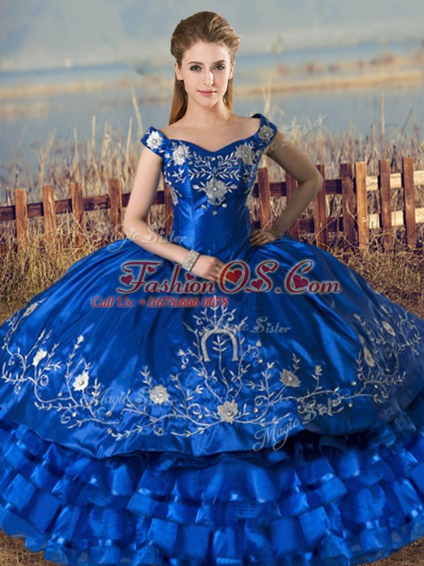 Off The Shoulder Sleeveless Lace Up Quinceanera Dress Royal Blue Satin and Organza