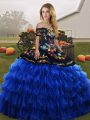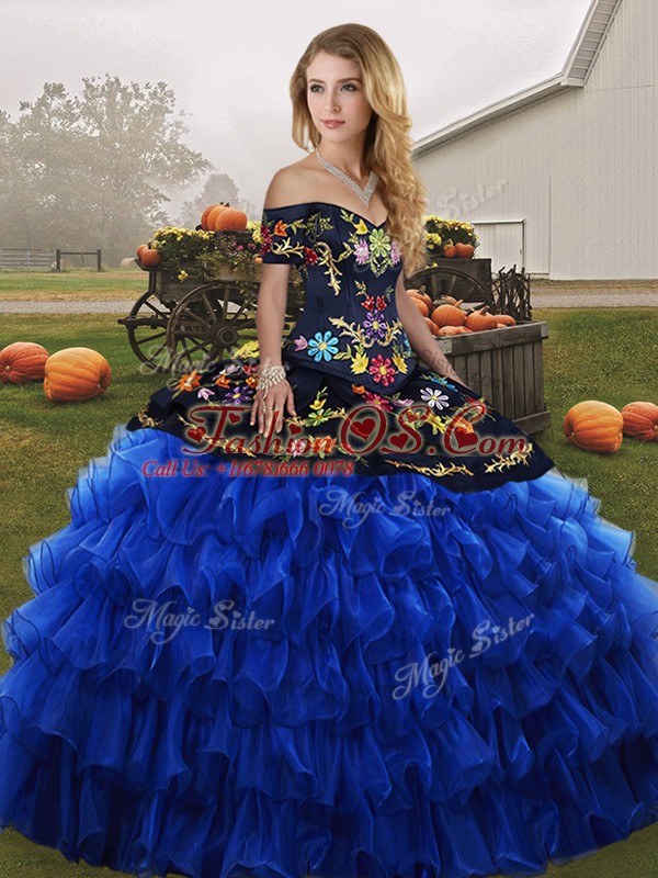 Off The Shoulder Sleeveless Lace Up Sweet 16 Dress Blue And Black Organza