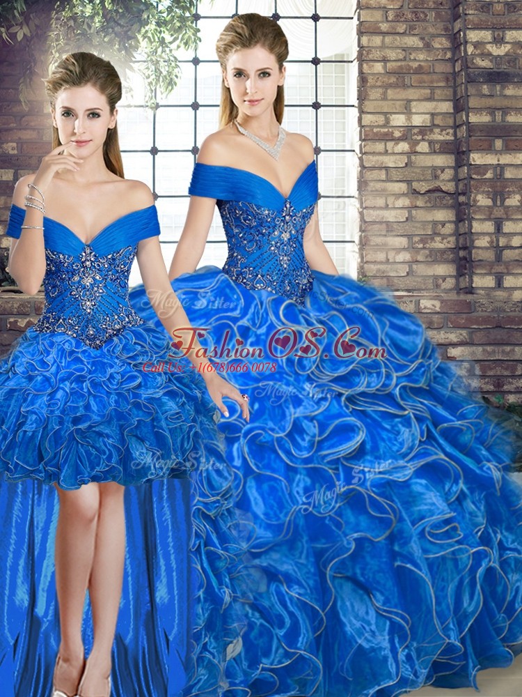 Home >  Quinceanera Dresses >  Detachable Quinceanera Skirts > Off The Shoulder Sleeveless Organza Quinceanera Dress Beading and Ruffles Lace Up