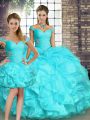 Off The Shoulder Sleeveless Quince Ball Gowns Floor Length Beading and Ruffles Aqua Blue Organza