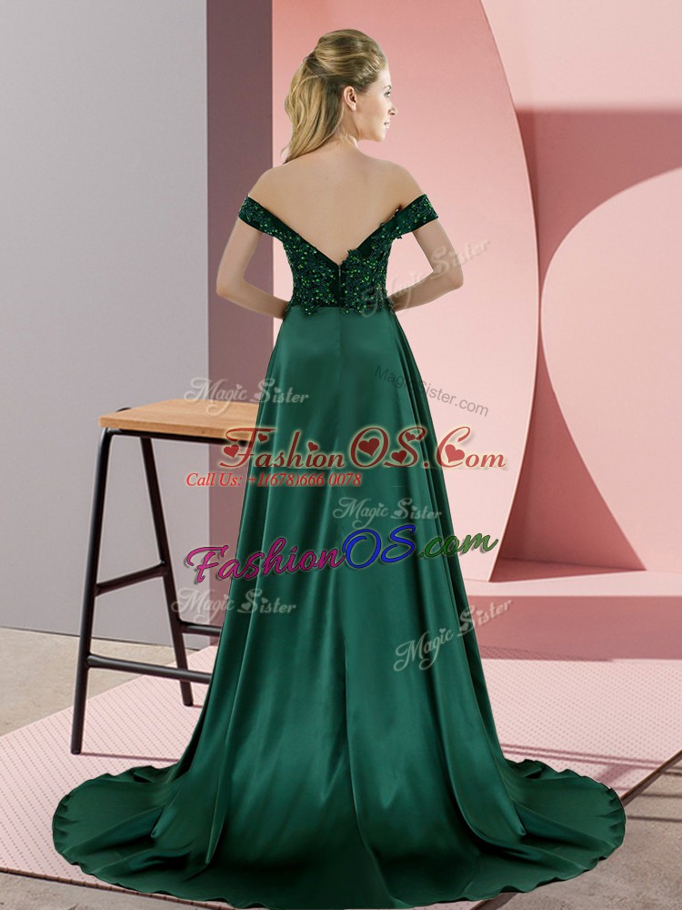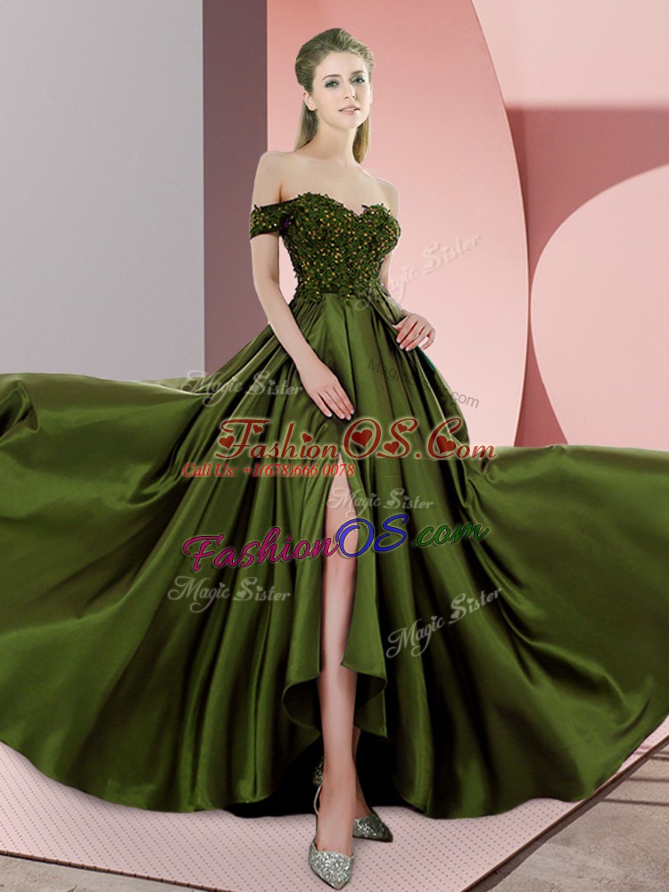 Home >  Prom Dresses >  Prom Dresses 2019 > Off The Shoulder Sleeveless Sweep Train Beading Olive Green Elastic Woven Satin