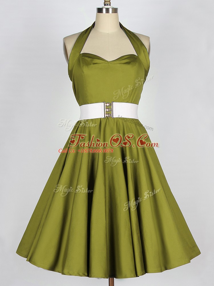 Olive Green A-line Taffeta Halter Top Sleeveless Belt Knee Length Lace Up Dama Dress for Quinceanera