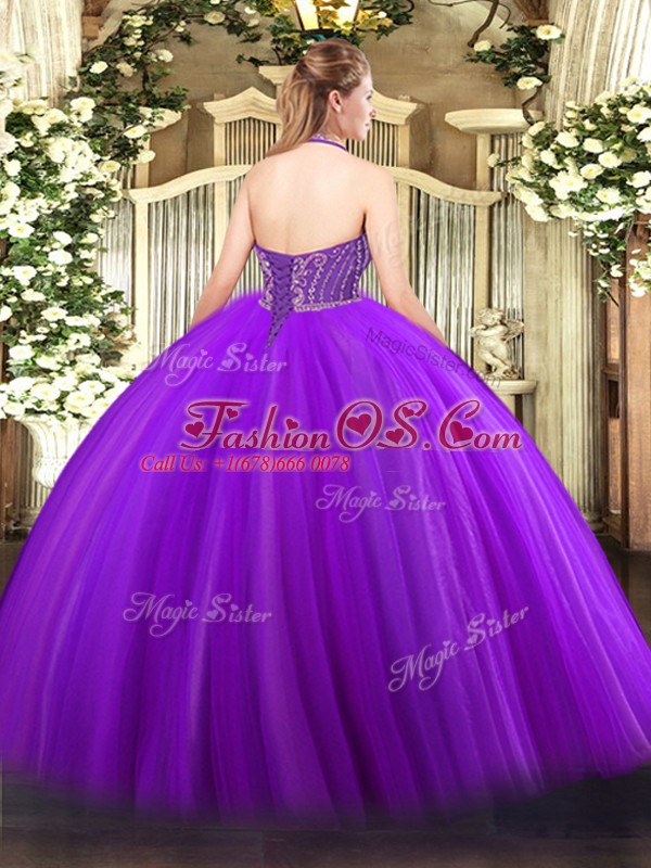 Olive Green Ball Gowns Tulle Halter Top Sleeveless Beading Floor Length Lace Up Quince Ball Gowns