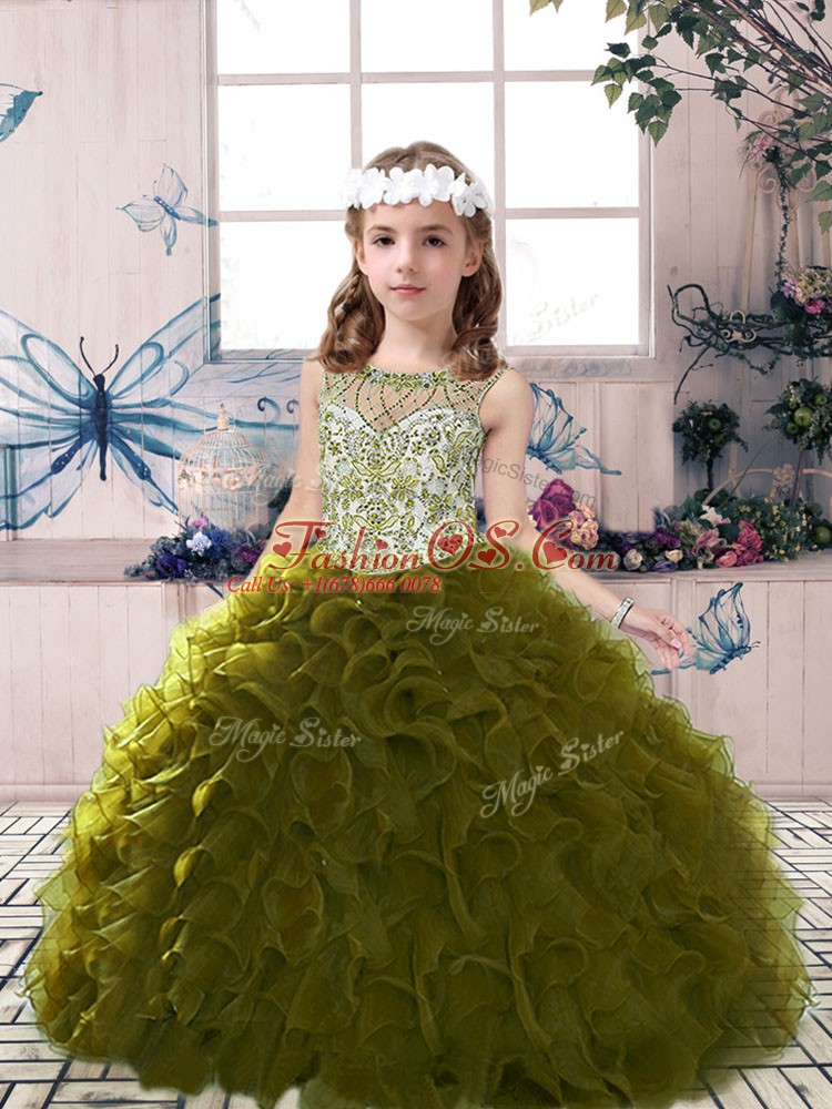 Home >  Special Occasion Dresses >  Beautiful Kids Pageant Dresses > Olive Green Ball Gowns Tulle Scoop Sleeveless Beading and Ruffles Floor Length Lace Up Pageant Dress for Teens