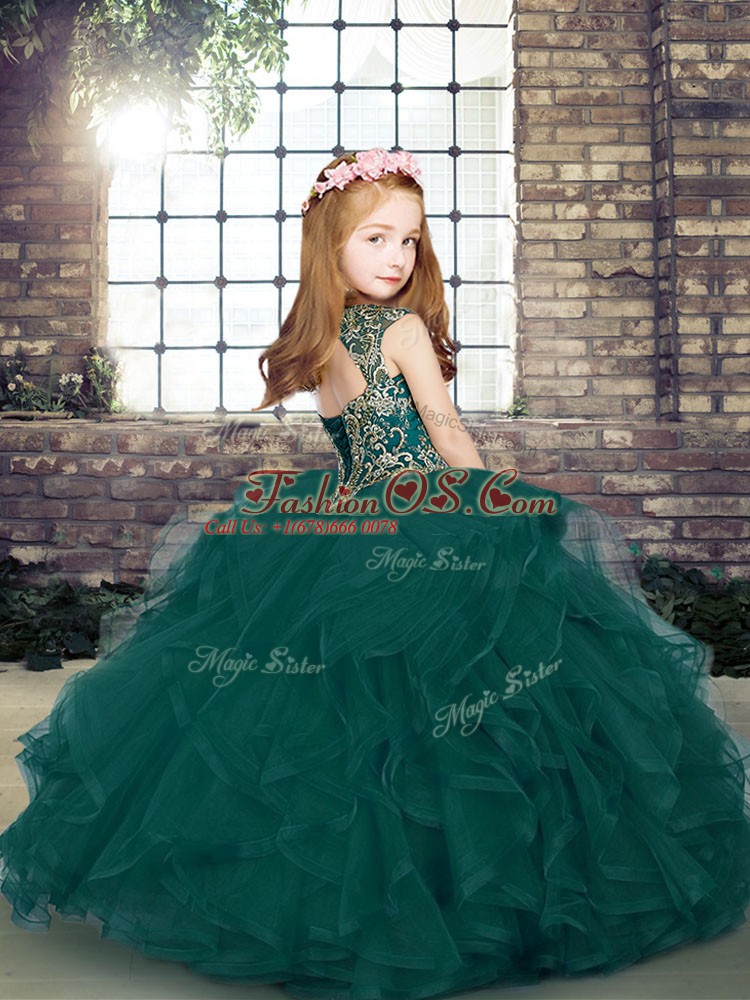 Olive Green Ball Gowns Tulle Straps Sleeveless Beading and Ruffles Floor Length Lace Up Kids Formal Wear