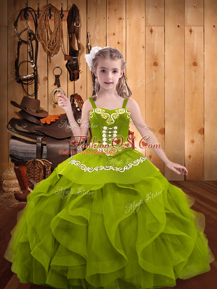 Olive Green Sleeveless Embroidery and Ruffles Floor Length Girls Pageant Dresses