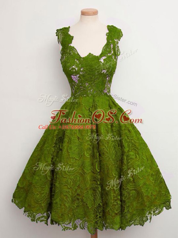 Olive Green Sleeveless Knee Length Lace Lace Up Vestidos de Damas