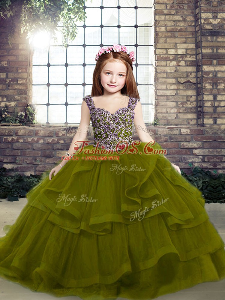 Home >  Special Occasion Dresses >  Beautiful Kids Pageant Dresses > Olive Green Straps Lace Up Beading and Ruffles Pageant Dress for Teens Sleeveless