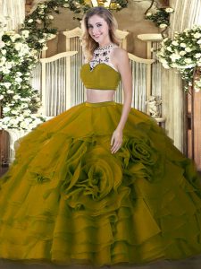 Olive Green Two Pieces Beading and Ruffled Layers Quinceanera Dresses Backless Tulle Sleeveless Floor Length