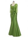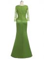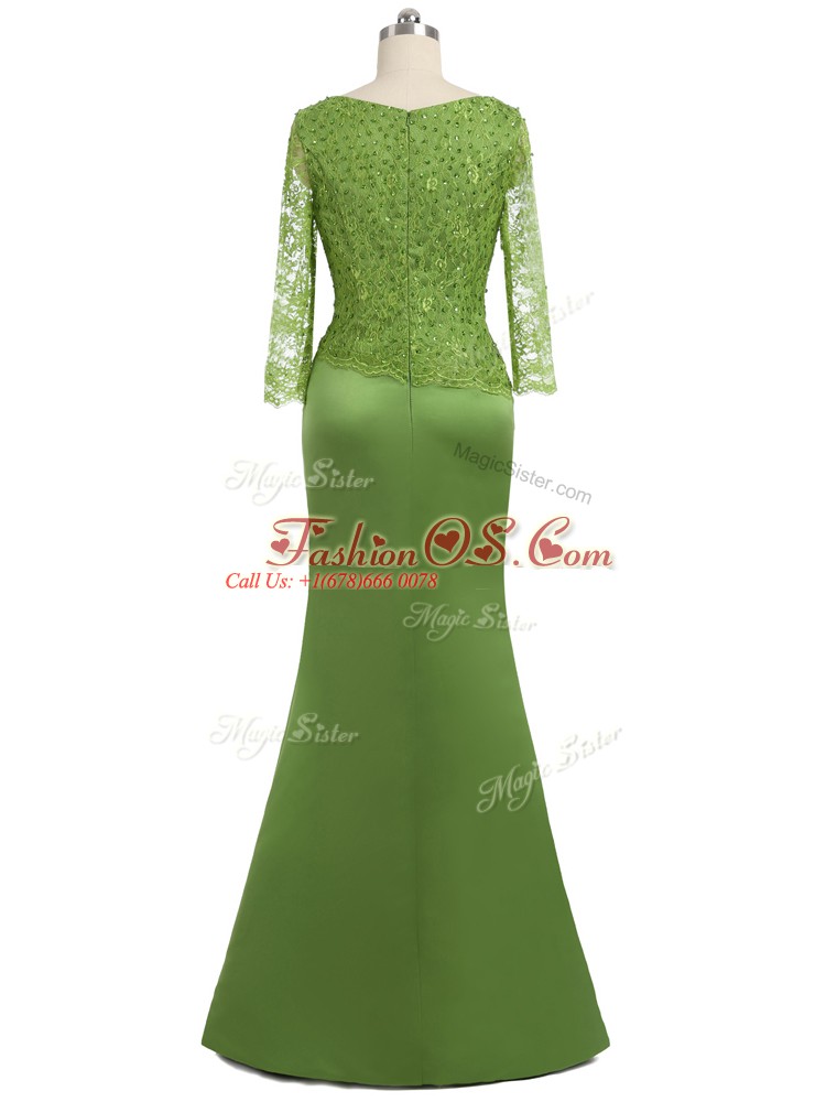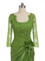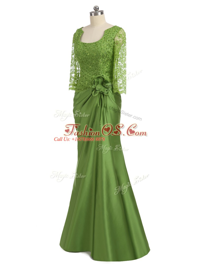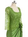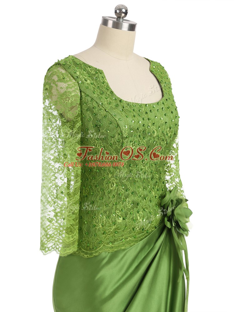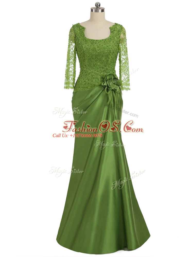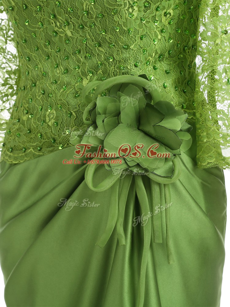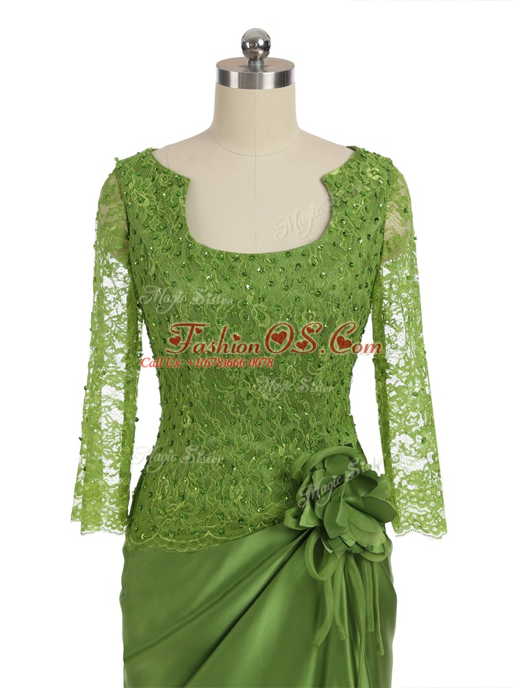Olive Green Zipper Scoop Lace and Appliques and Hand Made Flower Mother Of The Bride Dress Elastic Woven Satin Long Sleeves