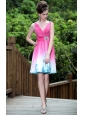 This v-line strap bodice is accented with sheer and beadings.The pleated and multi-color crystals adorn the waistline.The short skirt is highlighted with the butterfly print tull.The elegent short prom dress is pink and blue.