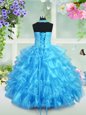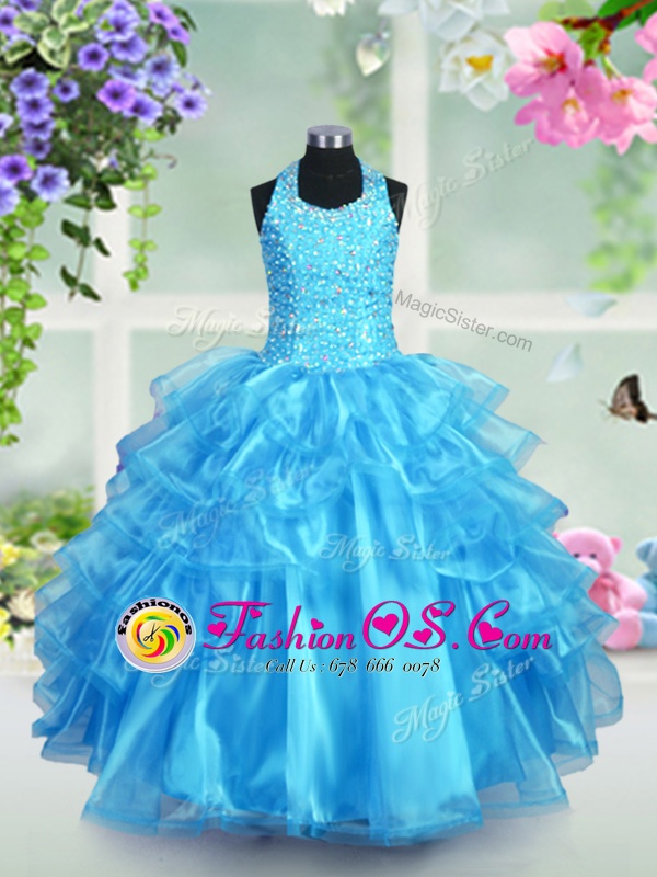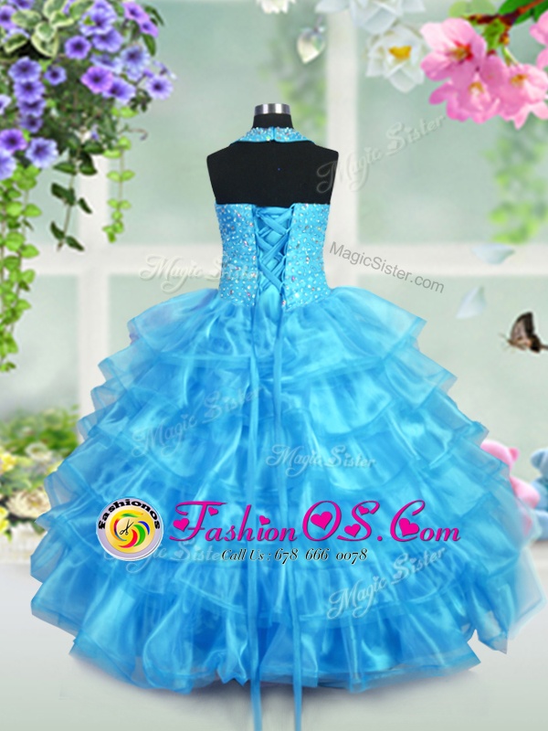 Home >  Special Occasion Dresses >  New Style Little Girl Pageant Dresses > On Sale Aqua Blue Lace Up Halter Top Beading and Ruffled Layers Child Pageant Dress Organza Sleeveless