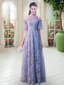 On Sale Grey Zipper High-neck Belt Dress for Prom Lace Half Sleeves