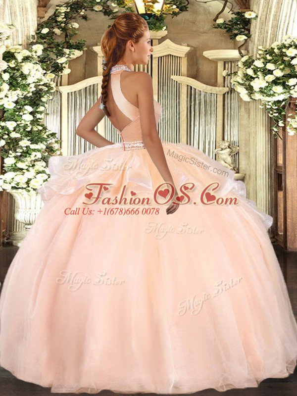 Home >  Quinceanera Dresses >  In Stock Quinceanera Dresses > On Sale Halter Top Sleeveless Sweet 16 Dresses Floor Length Beading and Ruffles Lilac Tulle