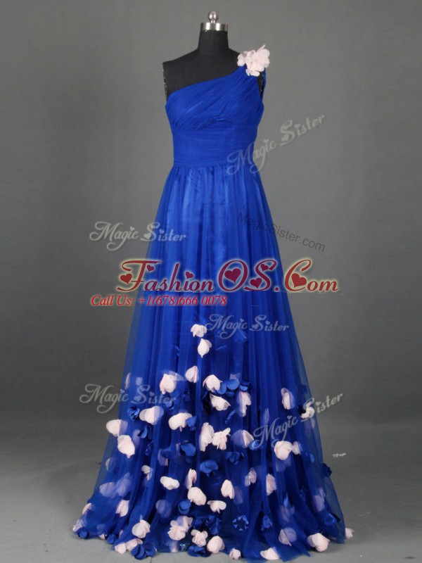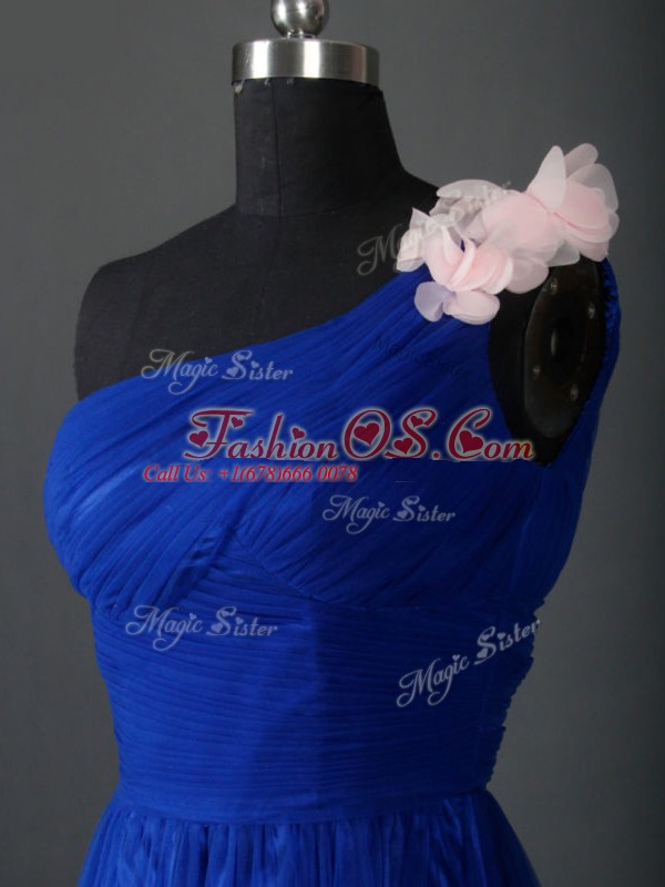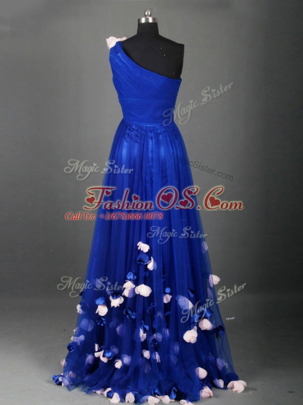 Home >  Prom Dresses >  Prom Dresses On Sale > On Sale Royal Blue One Shoulder Side Zipper Beading and Hand Made Flower Prom Dresses Sleeveless