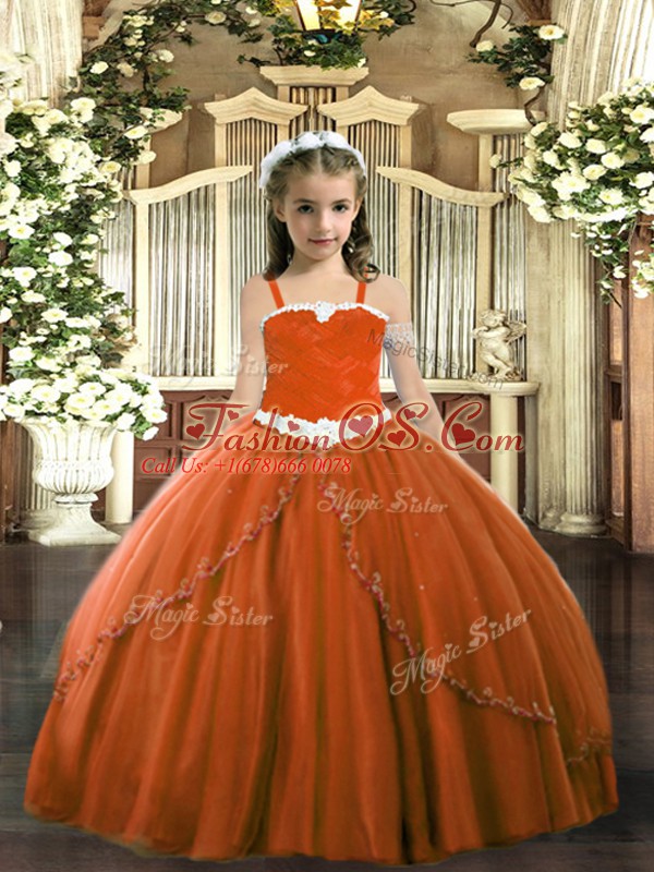 Home >  Special Occasion Dresses >  Lovely Little Girl Pageant Dresses > On Sale Rust Red Lace Up Straps Appliques Girls Pageant Dresses Tulle Sleeveless Sweep Train