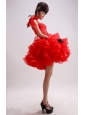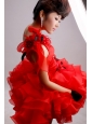 This gown features an elegant short one shoulder party dress with shimmering floral accents on the single strap. This bodice is covered with ruchings and is accented by some nice hand made flowers create the appearance of a curvier waist. Layers of ruffled tulle create a fun and flirty skirt. Heads turns when you are in this short dress at your big day.