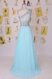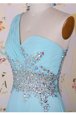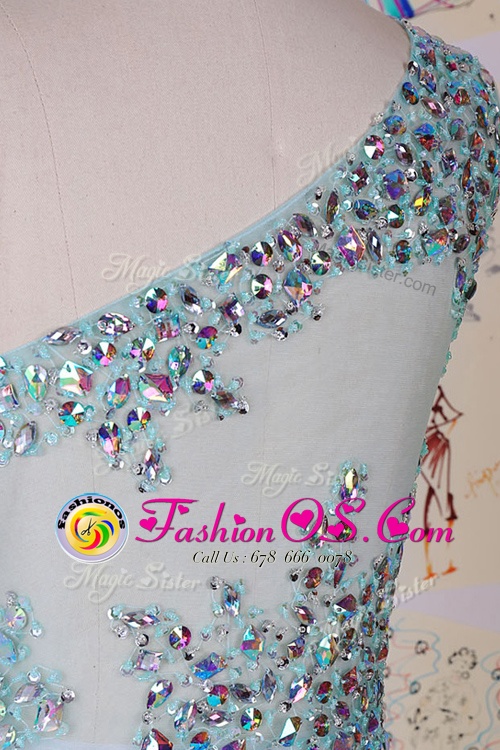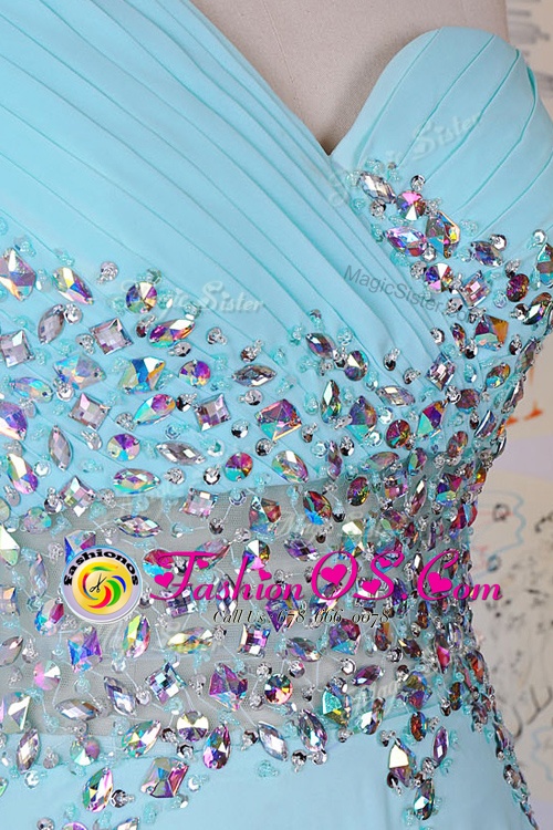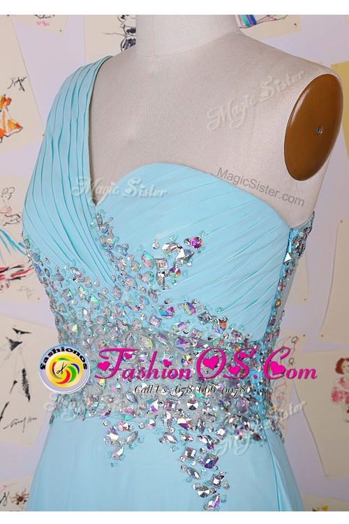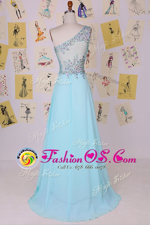 Home >  Prom Dresses >  Perfect Prom Dresses > One Shoulder Aqua Blue Sleeveless Chiffon Brush Train Side Zipper Homecoming Dress for Prom and Party