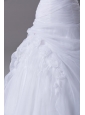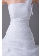 a fabulous gown for your grand wedding,this perfect wedding dress featurea a one shoulder neckline with handmade flower encrusted,the whole bodice is covered with ruching which continues to the hips,the skirt gathered at one side to create a fashionable and gorgeous look,similar handmade flowers are also employed on the skirt,the back of the skirt is completed with pick ups,lace up closure finishes the look,just so perfet,so gorgeous.