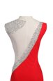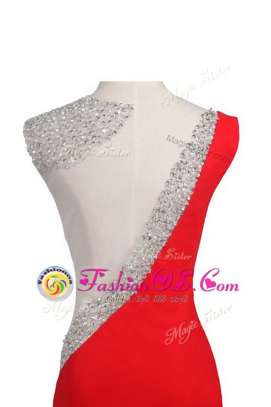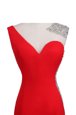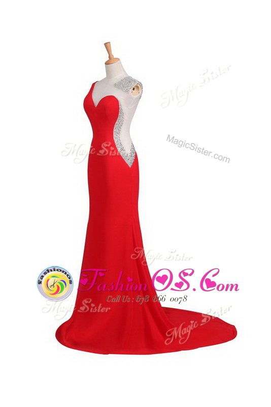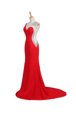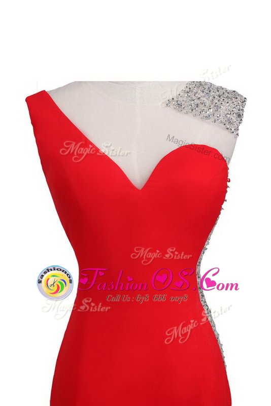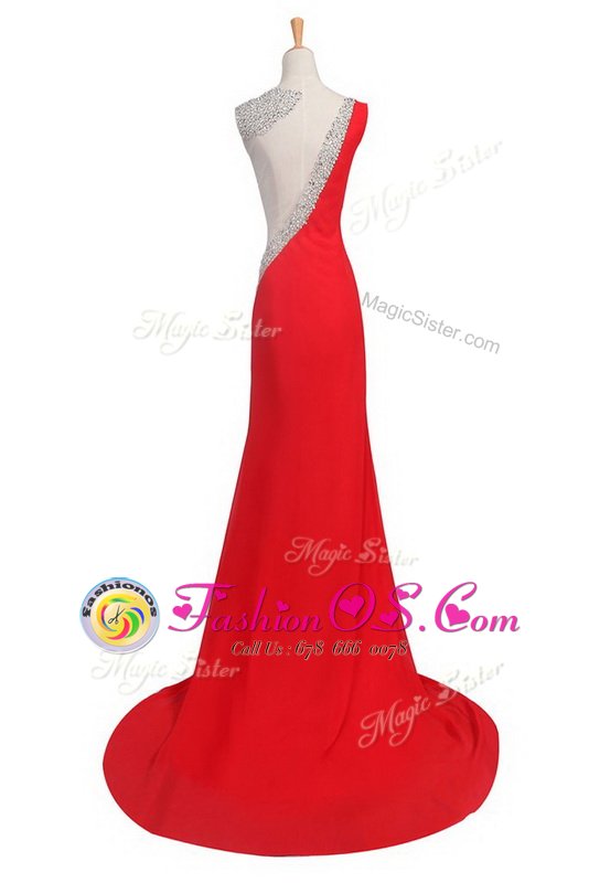 One Shoulder Coral Red Satin Backless Sleeveless Court Train Beading