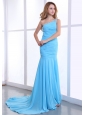 One Shoulder Decorate Bodice Ruching Light Blue Chiffon Brush Train 2013 Prom Dress