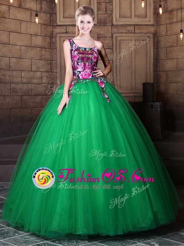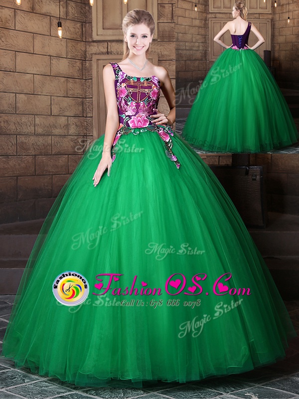 One Shoulder Green Sleeveless Pattern Floor Length Quinceanera Dress