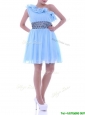 Home >  Special Occasion Dresses >  Dama Dresses for Quinceanera > One Shoulder Light Blue Dama Dress with Beaded Decorated Waist and Ruffles