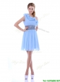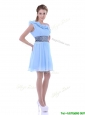 One Shoulder Light Blue Dama Dress with Beaded Decorated Waist and Ruffles