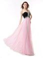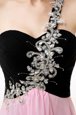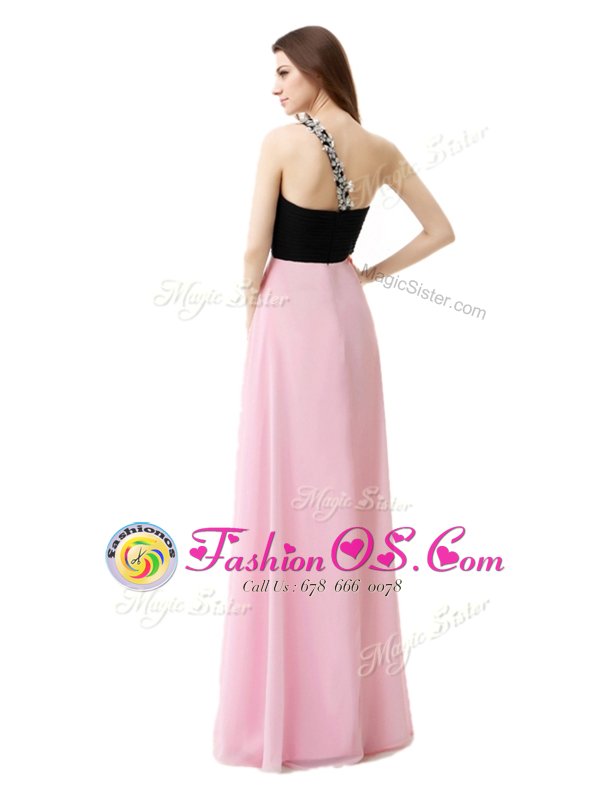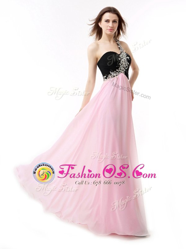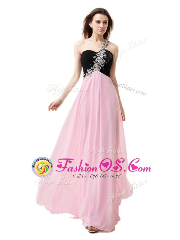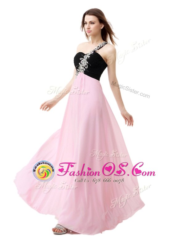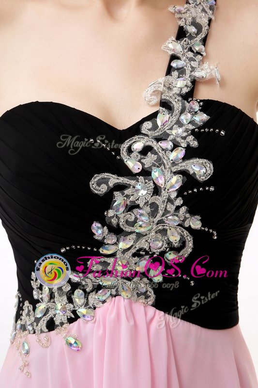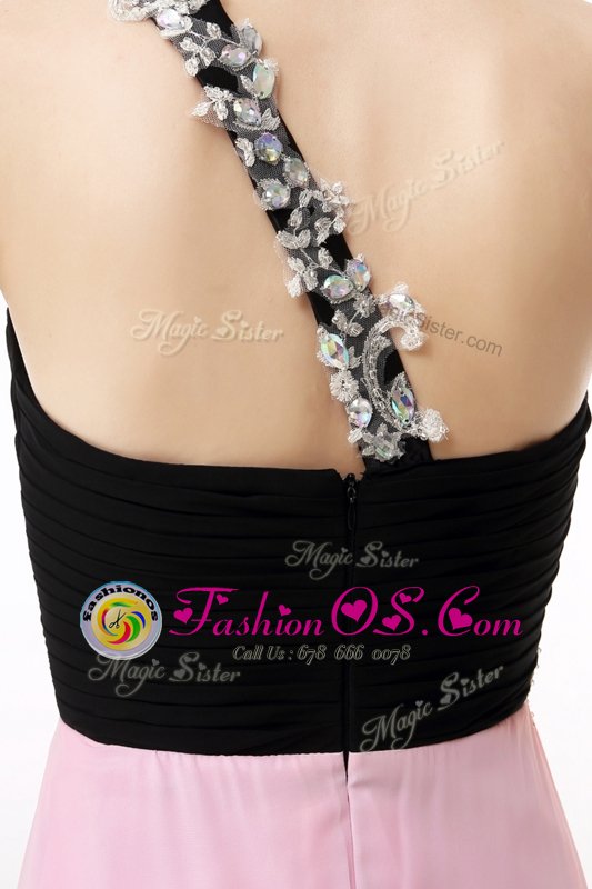 One Shoulder Pink And Black Sleeveless Beading and Appliques and Ruffles Floor Length Prom Dress