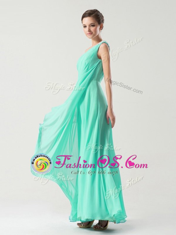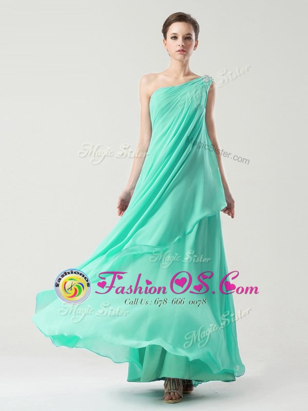 One Shoulder Sleeveless Ankle Length Beading and Ruching Side Zipper Prom Party Dress with Turquoise