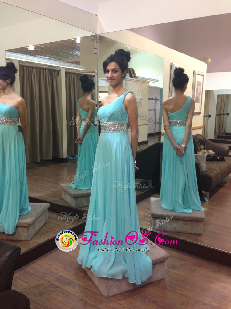 One Shoulder Sleeveless Beading Zipper Prom Homecoming Dress with Baby Blue Sweep Train