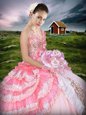Home >  Quinceanera Dresses >  Luxurious Quinceanera Dresses > One Shoulder Sleeveless Floor Length Beading and Embroidery and Ruffled Layers Lace Up Quinceanera Gown with Pink And White