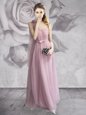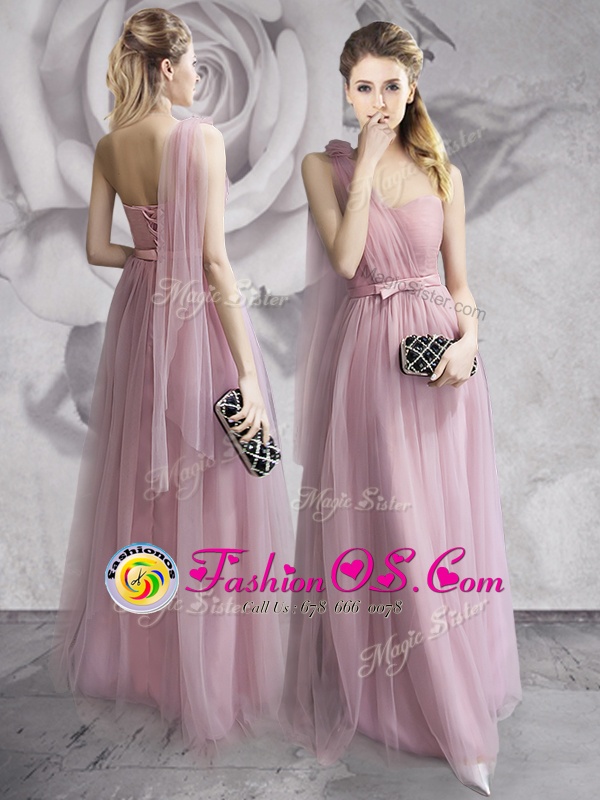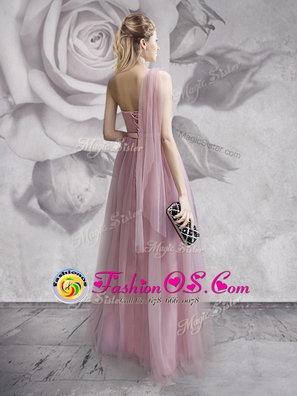 One Shoulder Sleeveless Lace Up Floor Length Ruching and Bowknot and Hand Made Flower Prom Dress