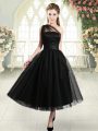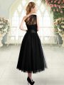 One Shoulder Sleeveless Prom Dress Tea Length Ruching Black Tulle