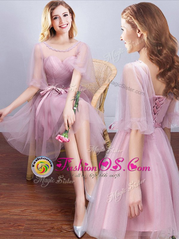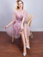 One Shoulder Sleeveless Tulle Mini Length Lace Up Court Dresses for Sweet 16 in Champagne for with Lace and Appliques and Belt