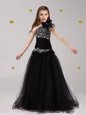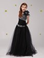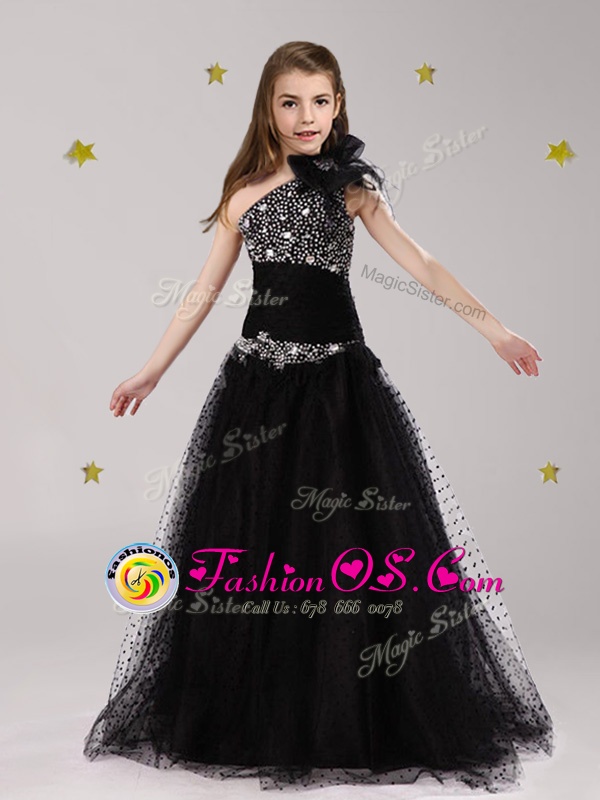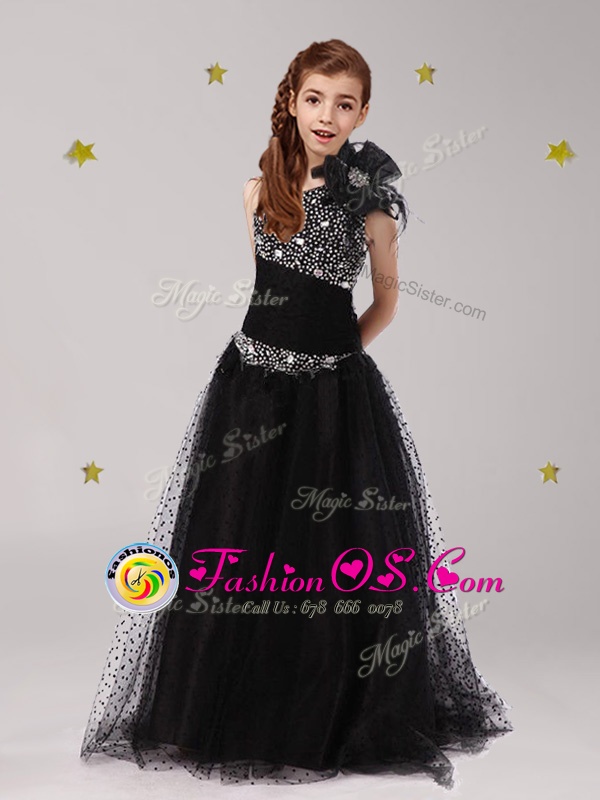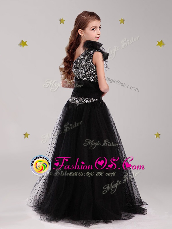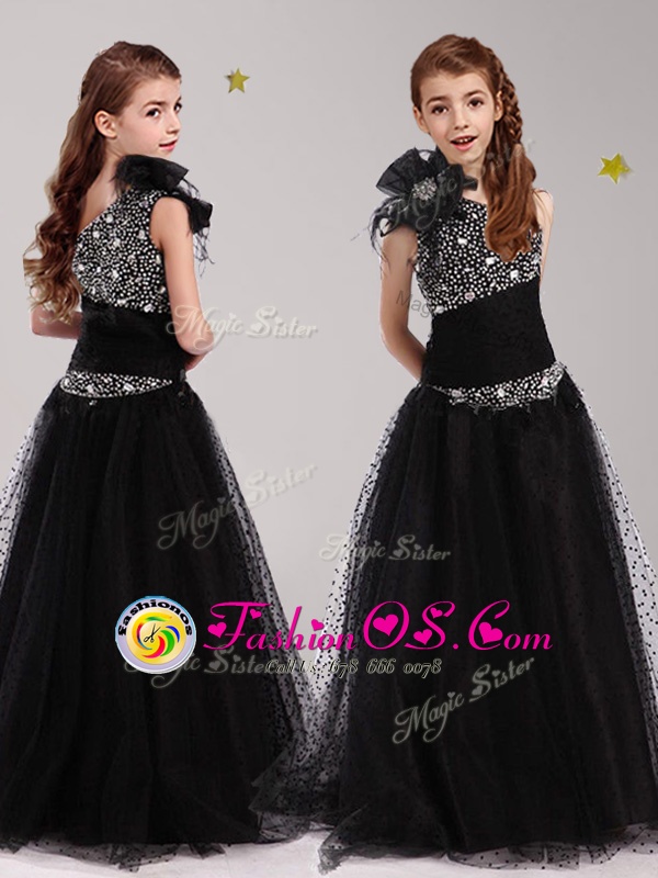 One Shoulder Tulle Sleeveless Floor Length Flower Girl Dress and Beading and Bowknot