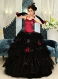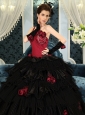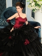 Home >  Quinceanera Dresses >  Fashionable Quinceanera Dresses > One Shoulder Wine Red And Black Ball Gown Hand Made Flowers Organza Ruffles Quinceanera Dress For Custom Made